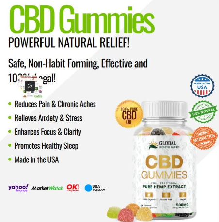 Global Health Farms CBD Gummies markets a line of full‑spectrum CBD gummies (500 mg strength per bottle, or per serving depending on their labeling) that claim to provide relief from pain, stress, sleep issues, and more. They are advertised as non‑habit forming, THC‑free (or trace THC < 0.3 %) and made with organic hemp.